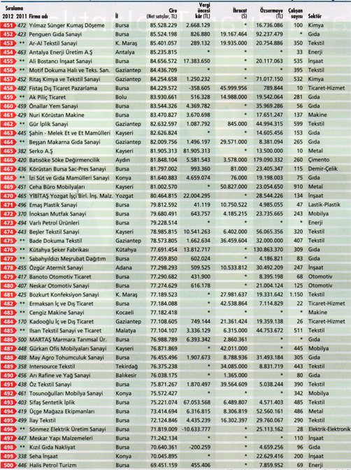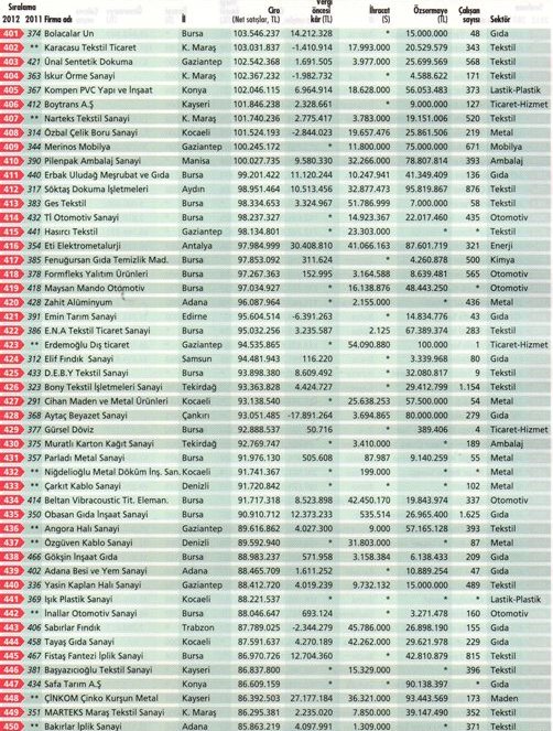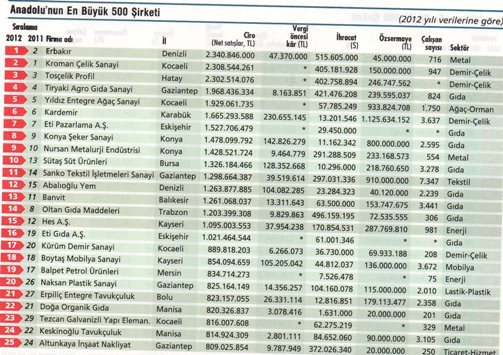 Anadolu’nun En Büyük 500 Şirketi sıralamasında 2012′de zirve el değiştirdi. İki yıldır ikinci sırada yer alan Erbakır, bu kez ilk sıraya tırmandı. Üç yıldır zirvede yer alan Kroman Çelik ise ikinci sıraya indi. Tosçelik, üçüncü sıradaki yerini korudu. 2012′de ekonomideki büyümenin yüzde 8,8′den yüzde 2,2′ye inmesi Anadolu 500′ü olumsuz etkiledi. Anadolu 500′ün toplam cirosu reel olarak sadece yüzde 2,7 artış gösterdi. Küresel ekonomideki durgunluk yüzünden Anadolu 500′ün ihracatındaki artış da yüzde 30,4′ten yüzde 4,2′ye geriledi.