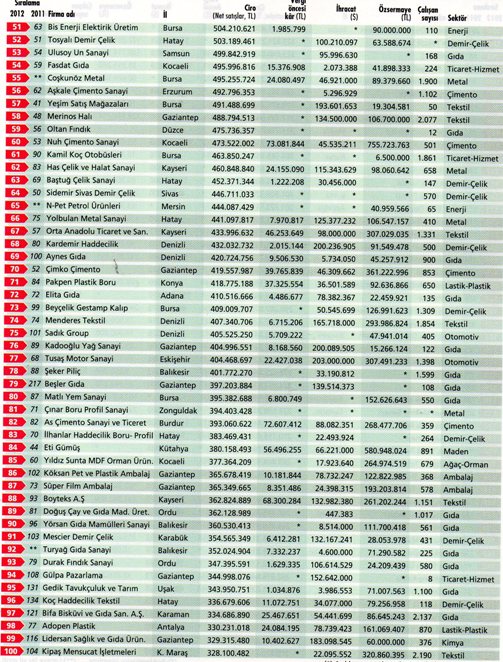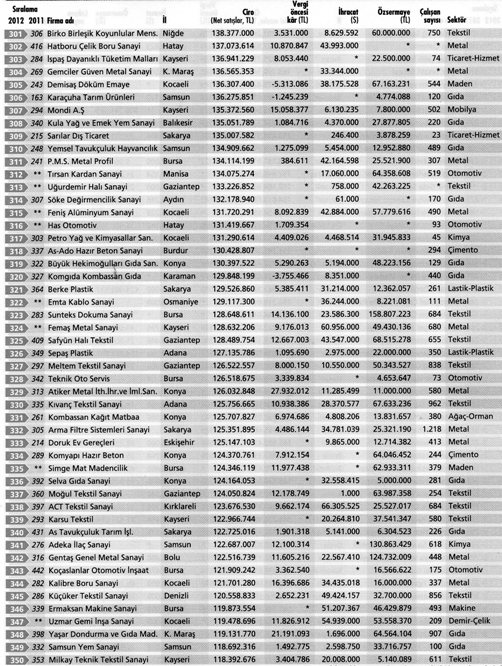 Erbakır, önceki iki yılda ikinci sırada yer alıyordu. Kroman ise üç yıldan beri zirvedeydi. Bu iki şirket 2012’de yer değiştirdi. Üçüncü sıradaki Tosçelik ise 2011’de buraya yükselmişti. Tosçelik böylece yerini korumuş oldu.